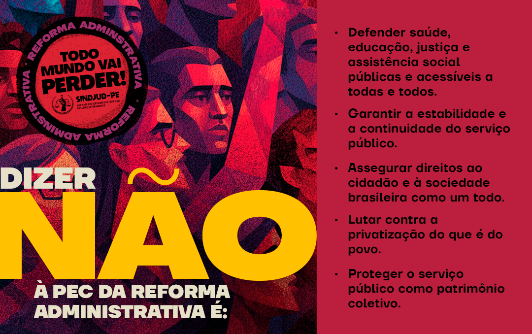 Dizer NÃO à PEC é preservar a saúde, a educação, a justiça e a assistência social públicas e acessíveis a todas e todos. É garantir a continuidade e a estabilidade de quem serve à população. É sustentar o compromisso do Estado com a igualdade e a dignidade. É impedir que o futuro do país seja guiado pela lógica do lucro e não pela do cuidado.