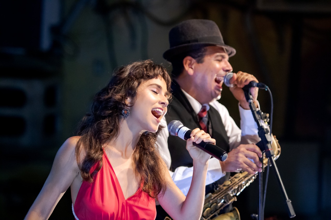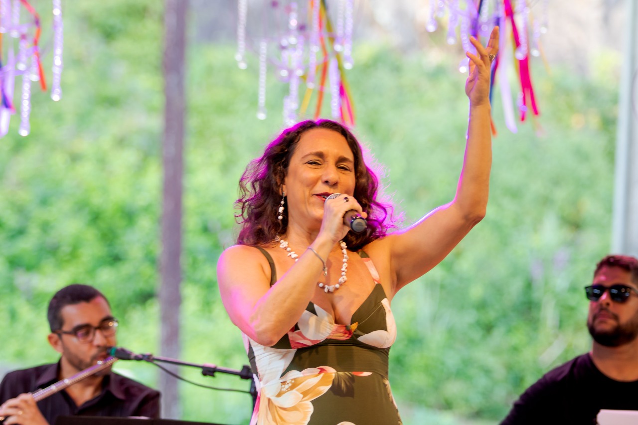 #PraCegoVer Galeria com oito imagens ilustra momentos do Bloco Brinque Com Isso Não ano III. Em destaque, na foto de capa da notícia, estão três mulheres posicionadas durante uma apresentação cultural: a cantora Flaira Ferro, a personagem que representa o bloco, e mais uma artista.