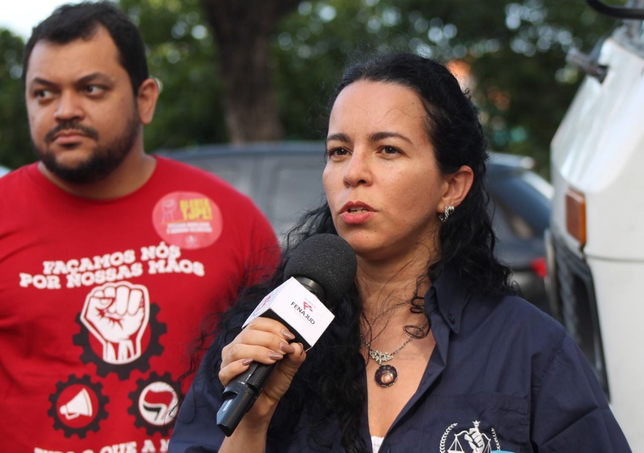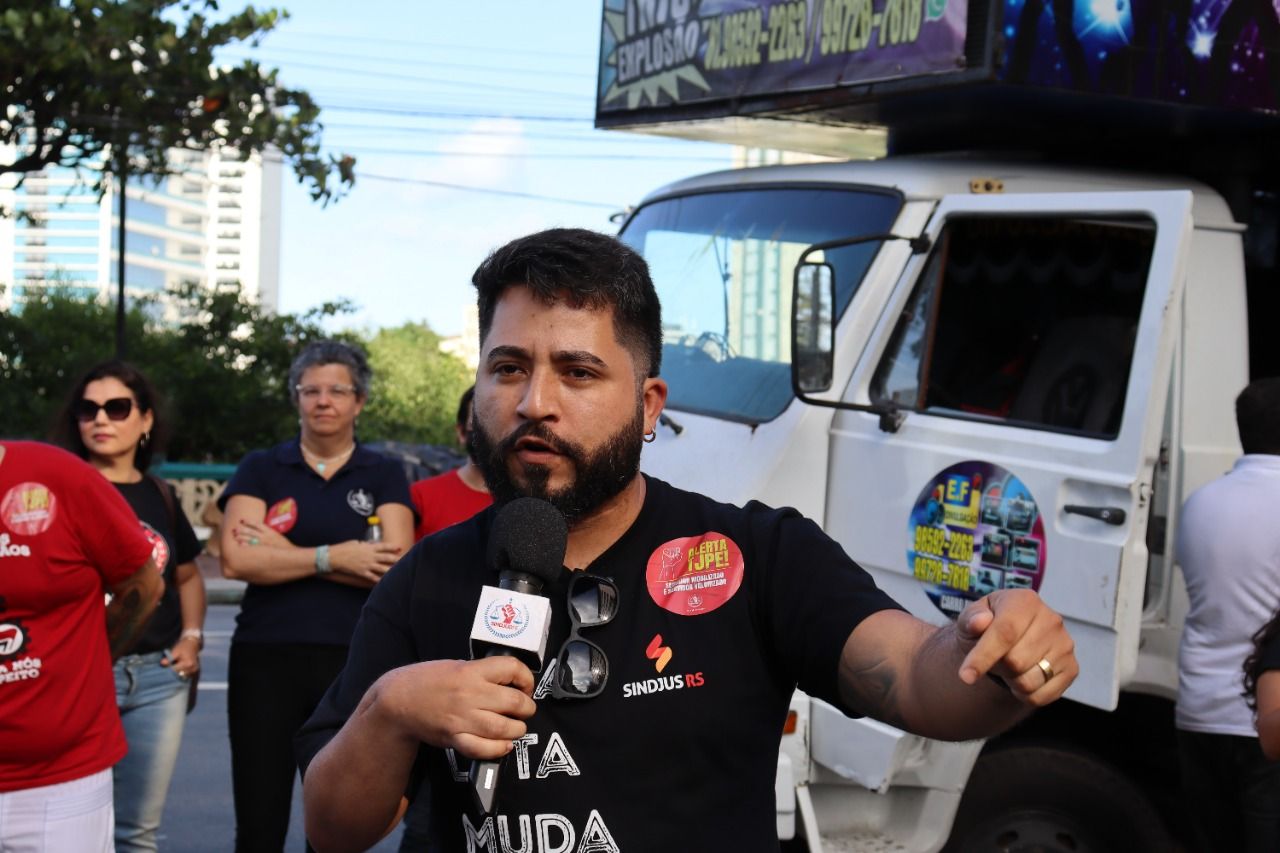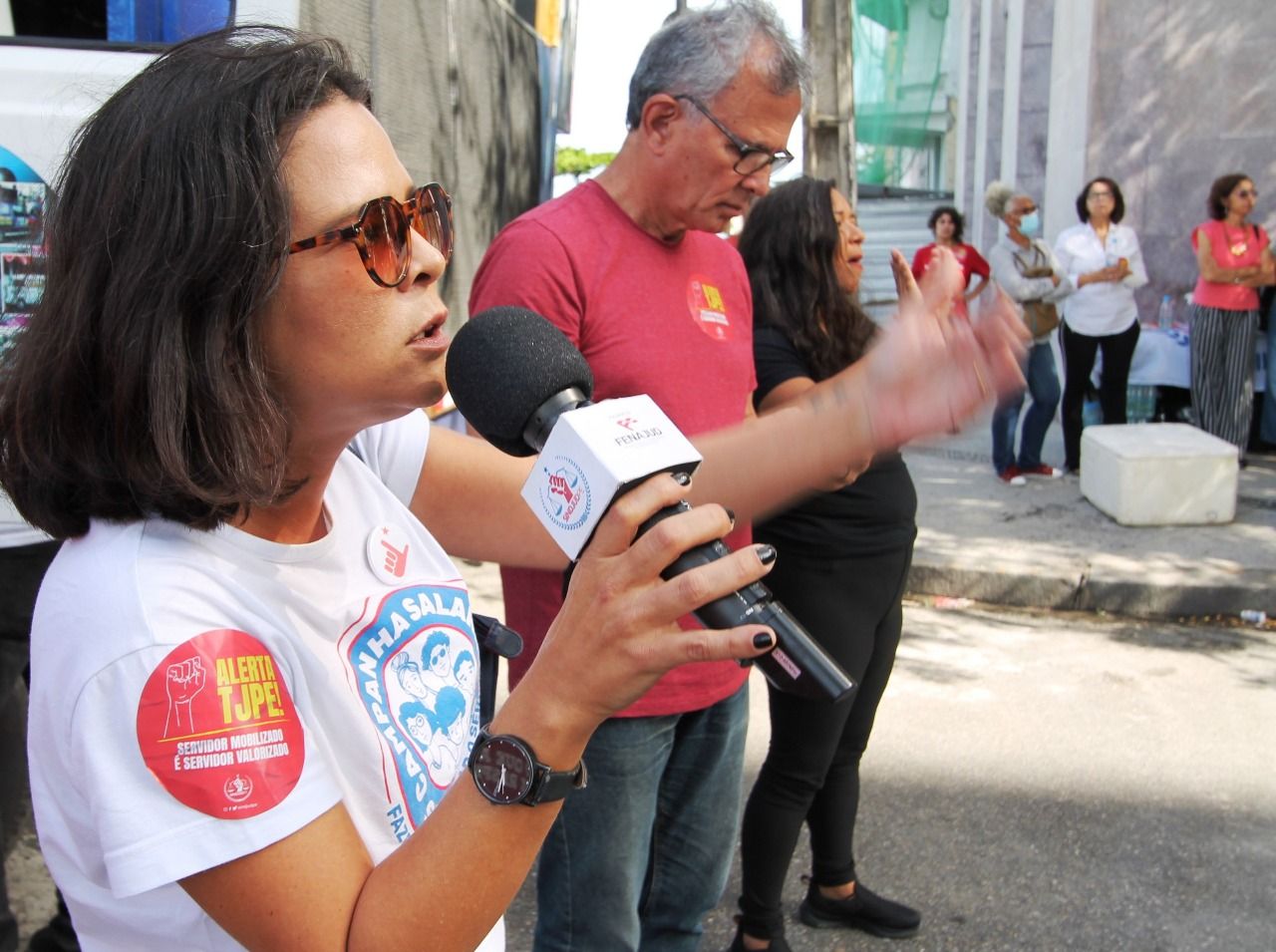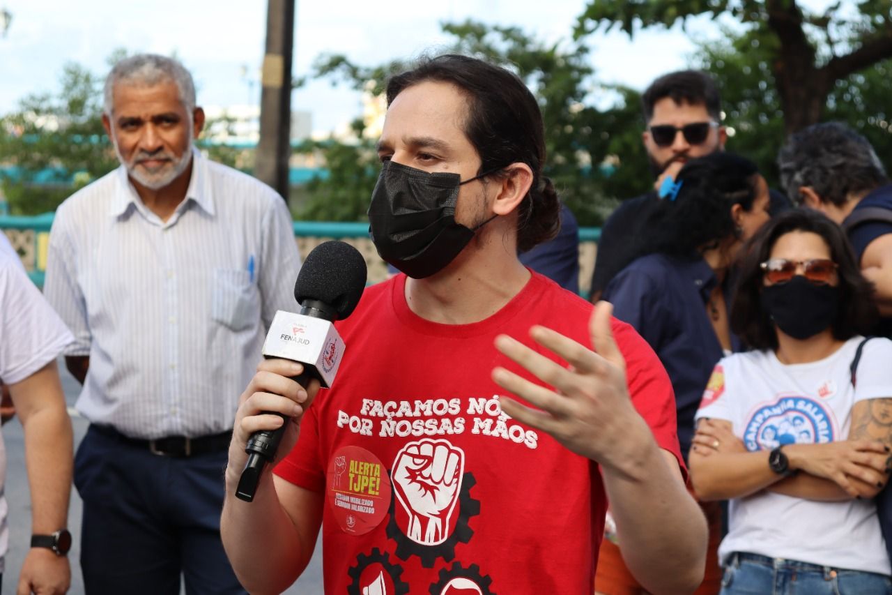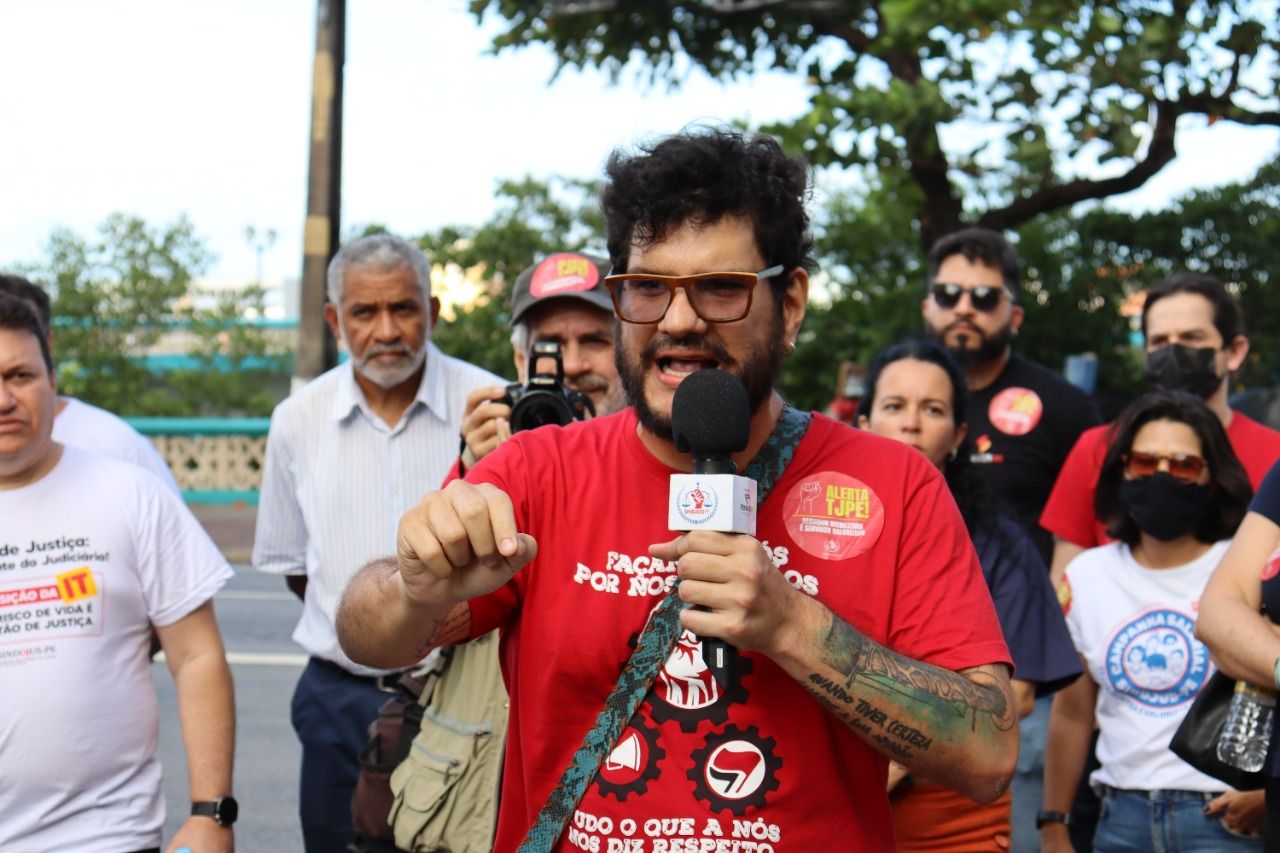 Na mesa do Ato Político, mediada pelo Coordenador-Geral do SINDJUD-PE, Alcides Campelo, e pelo Coordenador de Administração Giuseppe Mascena, membros das diretorias das entidades representativas e servidores(as) tiveram momento de fala para destacar a importância da articulação rumo às vitórias e expressar o descontentamento com o que estamos vivenciando neste momento.