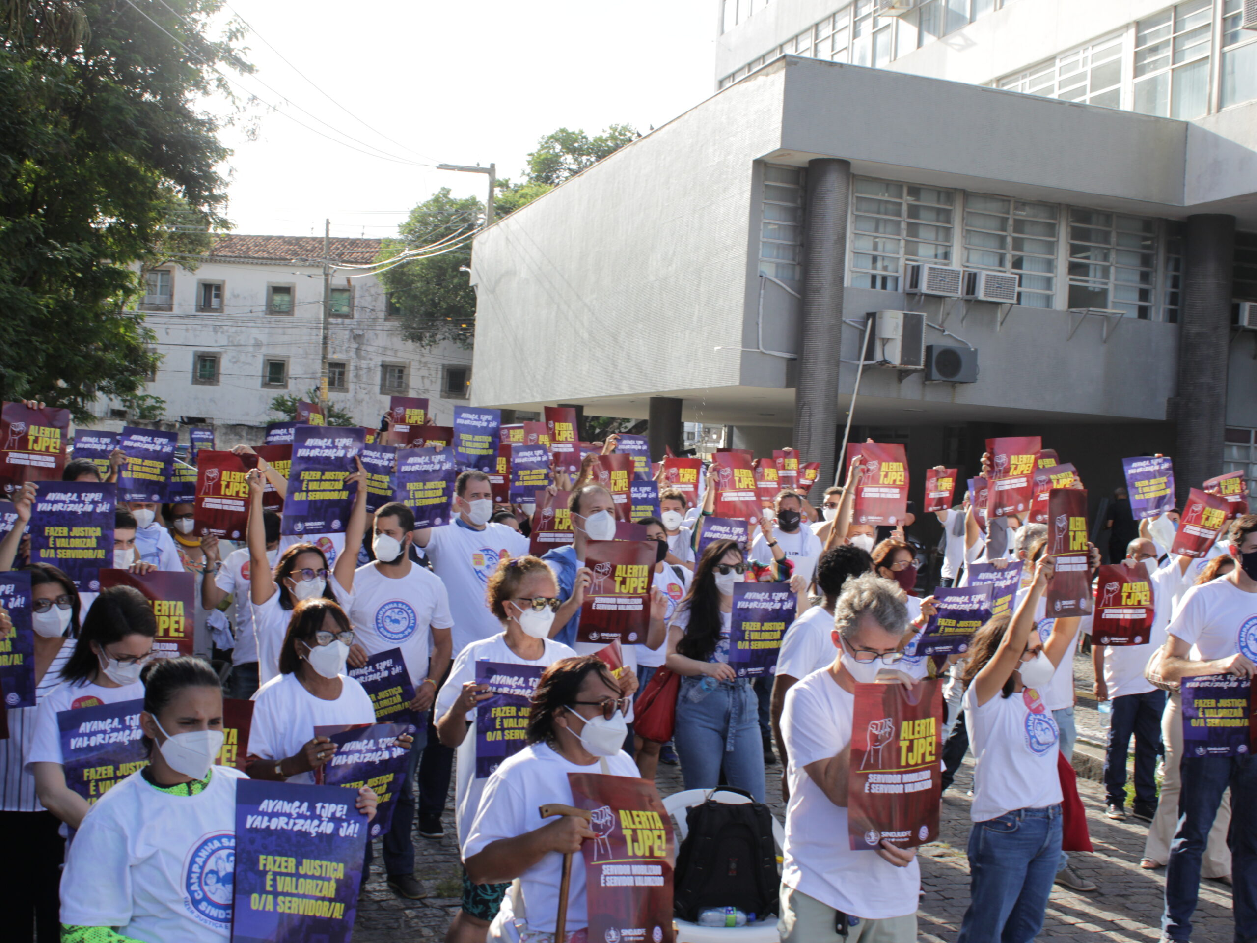 No dia 31/01, o SINDJUD-PE realizou a 1ª Assembleia Geral de 2022, em frente ao edf. Paula Baptista, no Centro do Recife. Na concentração, que contou com intervenção cultural de grupo de maracatu, mais de 150 servidores/as de 21 comarcas do estado estiveram articulados/as pela valorização profissional no TJPE. Número excelente, especialmente diante da situação atual de contágio da COVID-19.