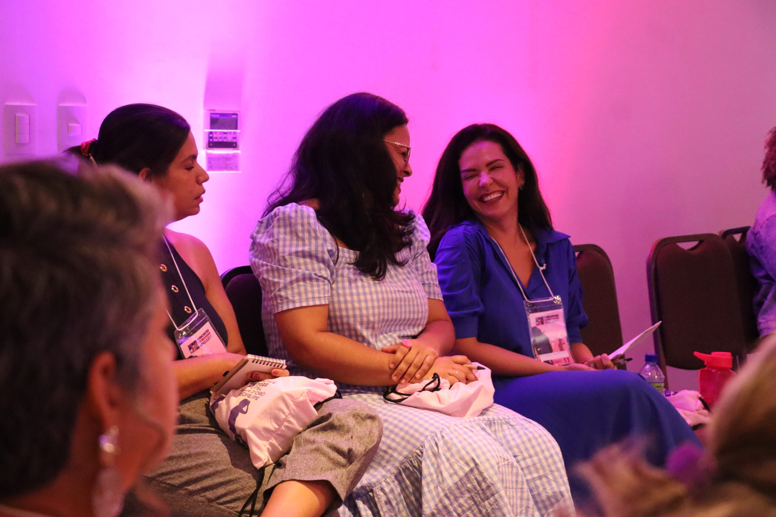 Após o almoço, a roda de diálogos intitulada “Juntas andamos melhor: o florescer de uma ética feminista” reuniu as palestrantes Suzana Veiga, Maria Carolina Medeiros e Thaysa Barbosa pensando sobre a necessidade de encontrar um feminismo que abrace a todas as mulheres com os devidos recortes de raça e classe social, reconhecendo e abraçando as diferenças de cada uma e entendendo que não existe mulher privilegiada quando estamos falando da garantia de direitos, visto que todas merecem ter seus corpos, escolhas e vivências respeitadas e preservadas.