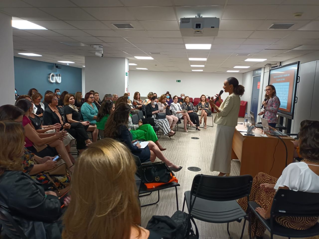 No primeiro dia, ao lado da Coordenadora da Fenajud, Anne Marques, a dirigente SINDJUD, Karyna Almeida, participou de quatro painéis que apresentaram estudos e estatísticas que ilustraram o contexto institucional discriminatório no qual as mulheres estão inseridas.