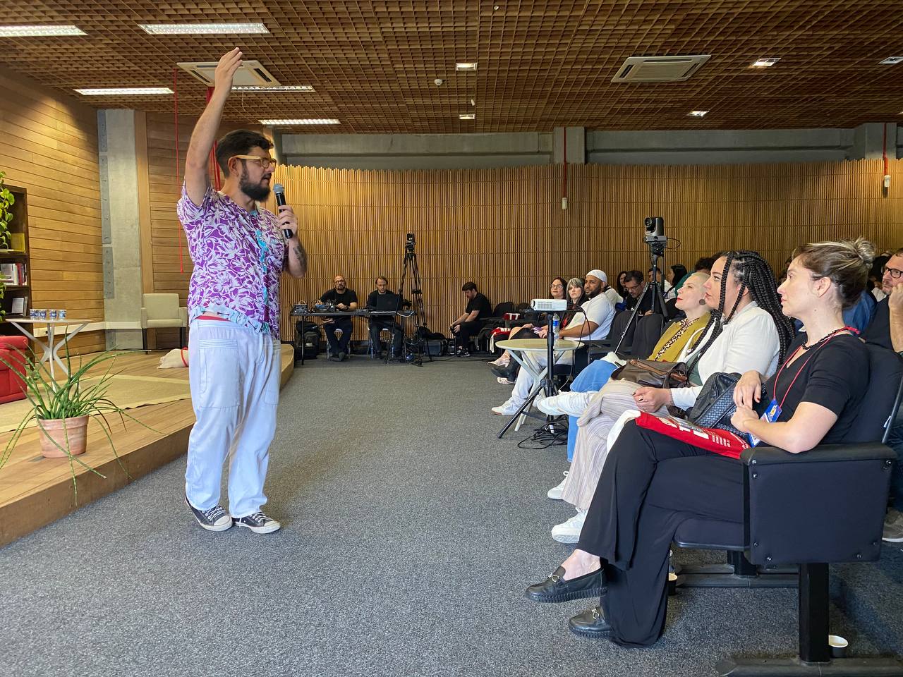 Giuseppe Mascena, Coordenador Geral do SINDJUD-PE, conduziu a apresentação da programação nos três dias de atividades por meio de intervenções poéticas relacionadas com os temas do Seminário, que buscou aproximar o conhecimento sindical, a pesquisa acadêmica e a experiência histórica da saúde coletiva a fim de estimular um debate profundo sobre a saúde e o adoecimento dos trabalhadores e trabalhadoras na atualidade.