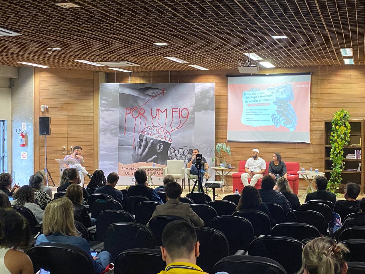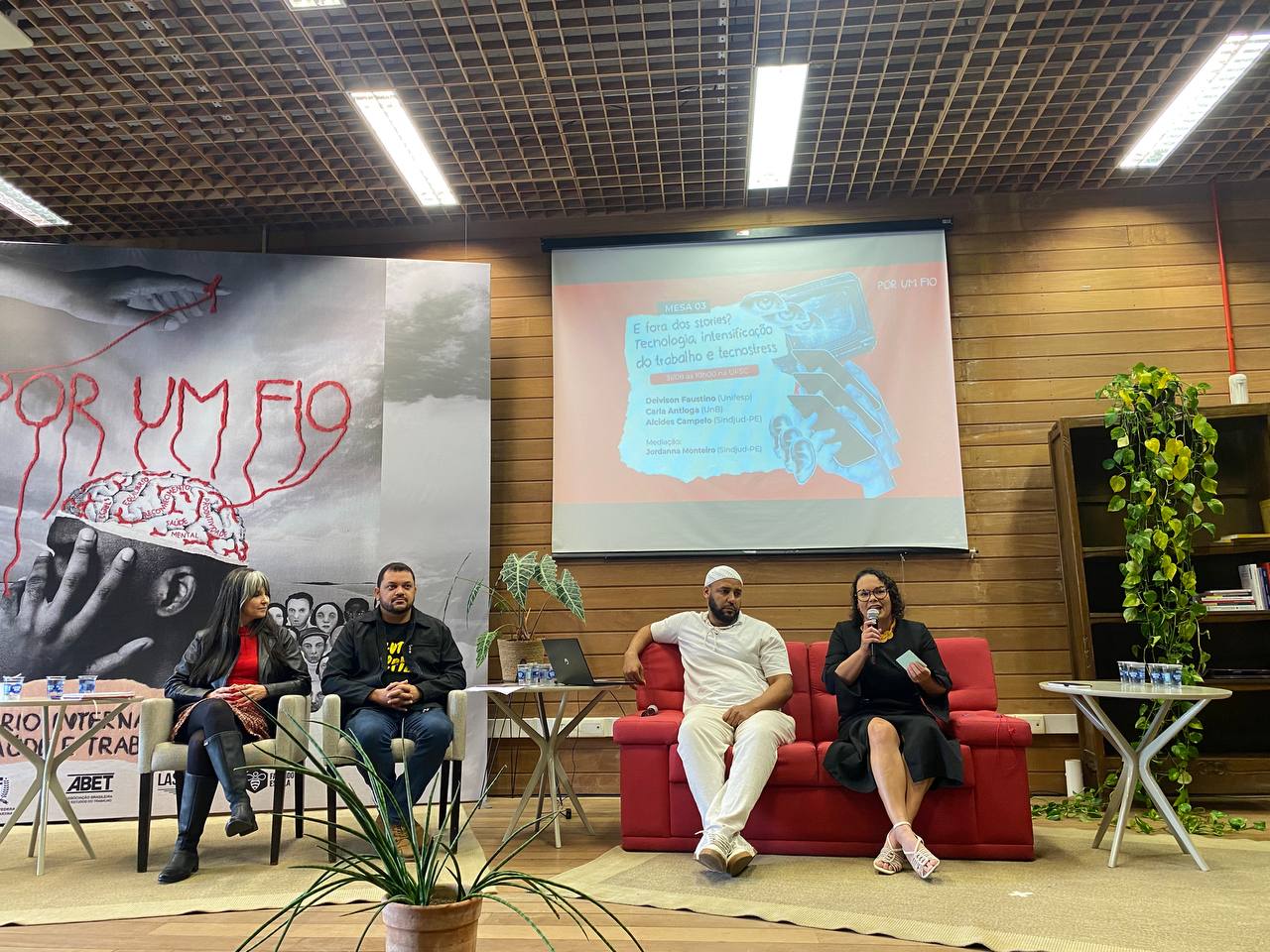 Alcides Campelo, Coordenador de Finanças da entidade, integrou o painel mediado pela Coordenadora de Formação Sindical, Política e Profissional, Jordanna Monteiro, intitulado “E fora do story? Tecnologia, intensificação do trabalho e tecnostress”. Deivison Faustino (Unifesp) e Carla Antloga (Unb) também estiveram na formação da mesa.
