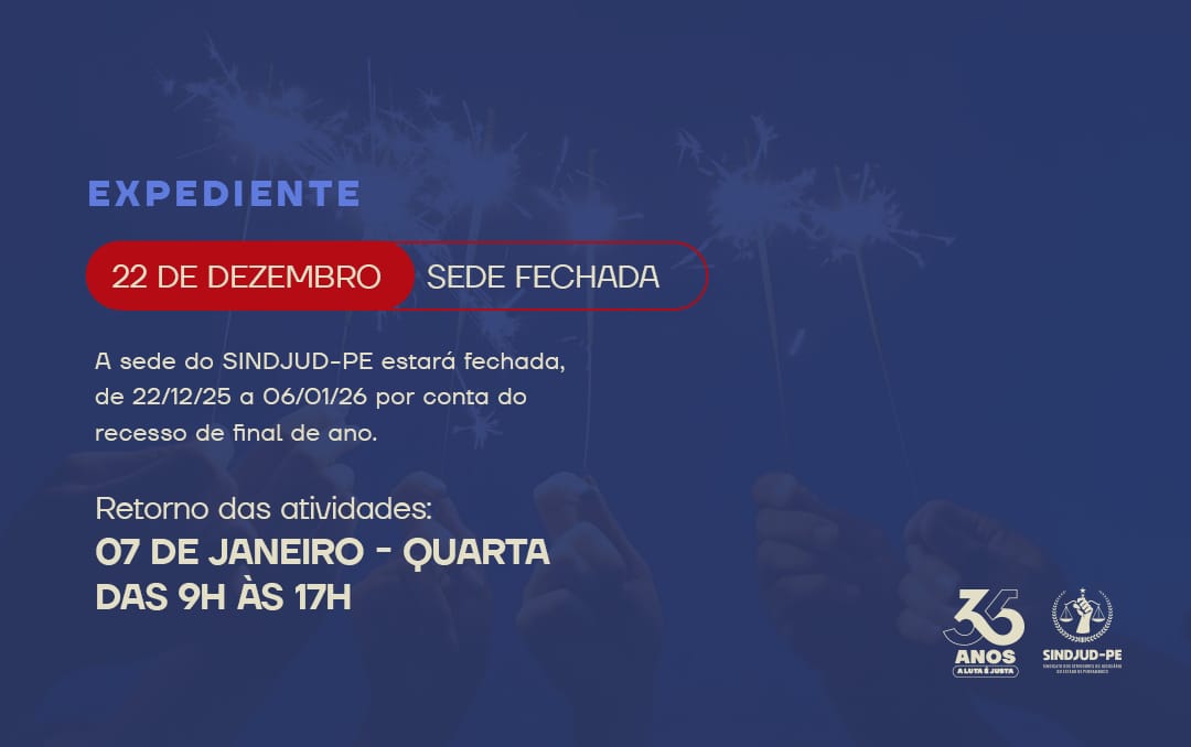 Em razão do período de festividades de Natal e fim de ano, a sede do SINDJUD-PE estará fechada a partir do dia 22 de dezembro.