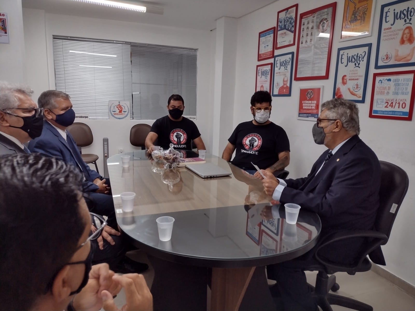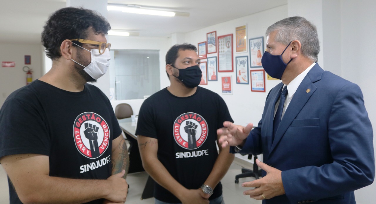 Todos os membros presentes, o Presidente eleito Desembargador Luiz Carlos de Barros Figueiredo, o Corregedor Geral eleito Ricardo de Oliveira Paes Barreto, o 2º Vice Presidente eleito Antônio de Melo e Lima, o Juiz assessor Glaydson Lima, Silas da Costa e Silva, cerimonial do TJPE, conheceram rapidamente a sede e as condições de trabalho dispostas para os funcionários do SINDJUD-PE e elogiaram os cuidados com os protocolos de saúde adotado na sede do sindicato.