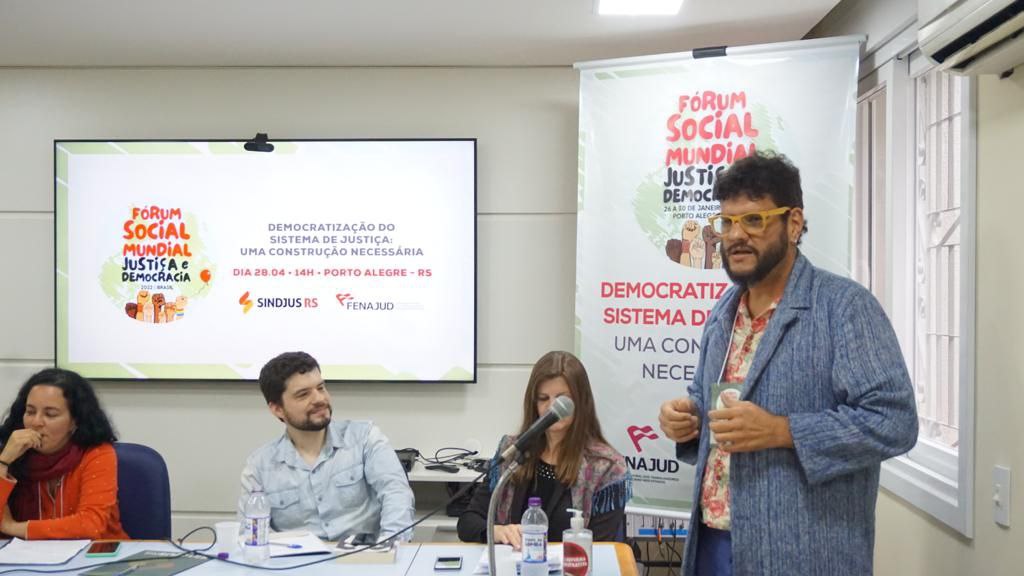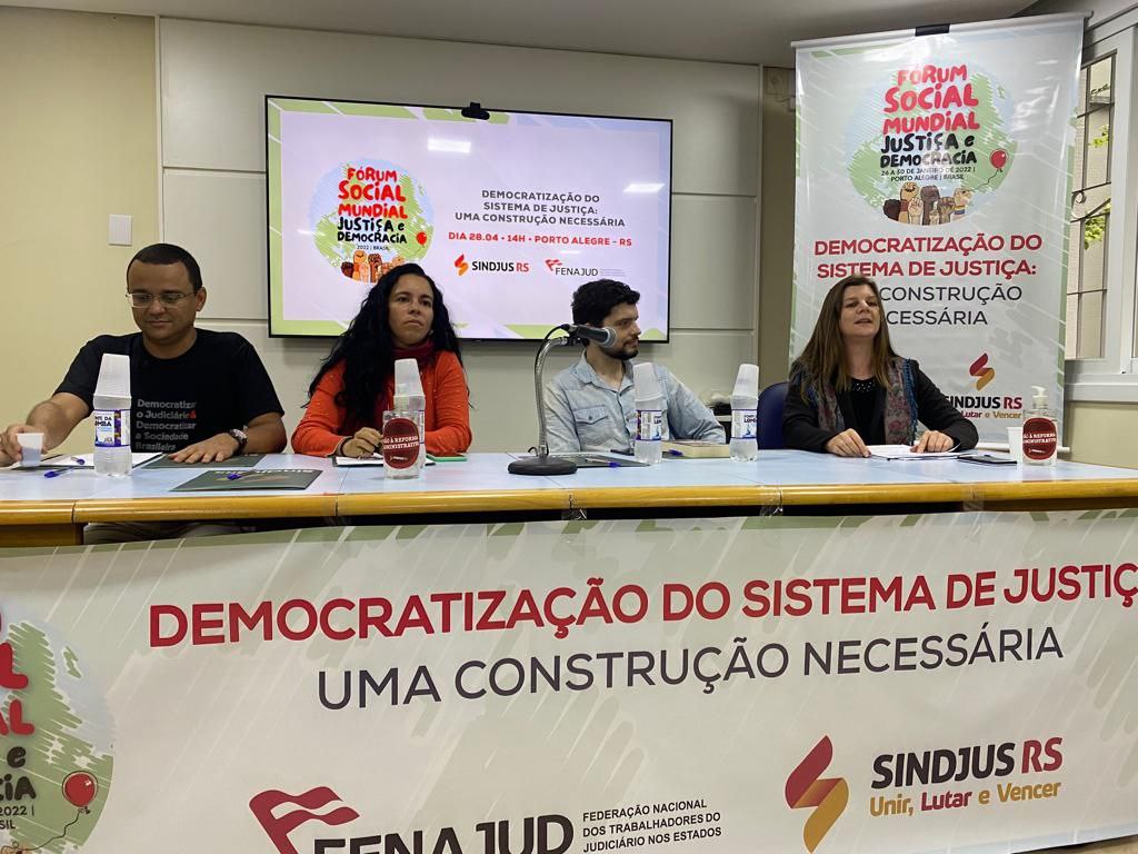 No dia 27/04 uma das mesas do evento ilustrou as contradições e perspectivas no pós-pandemia relacionadas ao mundo do trabalho e as instituições públicas sob a ótica do capitalismo. Já no dia 28/04, representado pela coordenadora de Comunicação Ana Carolina Lôbo, que também coordena pasta na FENAJUD, o SINDJUD integrou a mesa “Democratização do sistema de Justiça: uma construção necessária”, que contou com membros de outros sindicatos de servidores(as) do judiciário e da Federação. A coordenadora Karyna Almeida e os coordenadores Giuseppe Mascena e Pedro Wallisson, também fizeram parte da caravana do SINDJUD ao FSMJD.