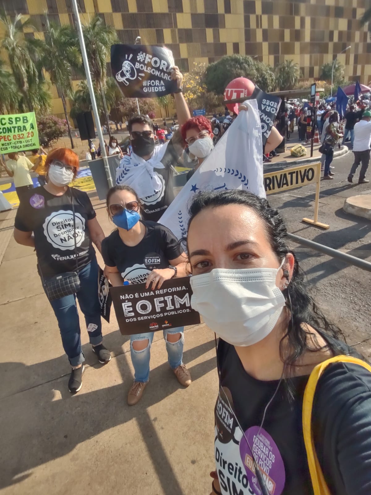 No ato “Ocupa Brasília”, ocorrido nos dias 14 e 15 de setembro para o qual todos os sindicatos do judiciário foram convocados pela FENAJUD, enviamos uma delegação composta de nove integrantes: seis coordenadores/as, três homens (Giuseppe Mascena, coordenador de Administração, Pedro Wallison, coordenador de Saúde, e Hugo Andrade, coordenador de Formação Política) e três mulheres (Ana Carolina Lôbo, coordenadora de Comunicação, Mariana Figueiroa, coordenadora de Assuntos Jurídicos, e Karyna Almeida, coordenadora de Gênero, Raça e Etnia), e três mulheres servidoras da base (Miriam Mesquita, Janayna France e Gisely Malagueta), mostrando que a participação feminina só cresce e veio para ficar (inclusive porque as mulheres são maioria no serviço público brasileiro em geral e no judiciário também; desta forma, serão as maiorias prejudicadas por uma eventual aprovação da PEC).